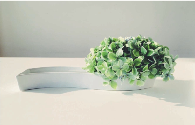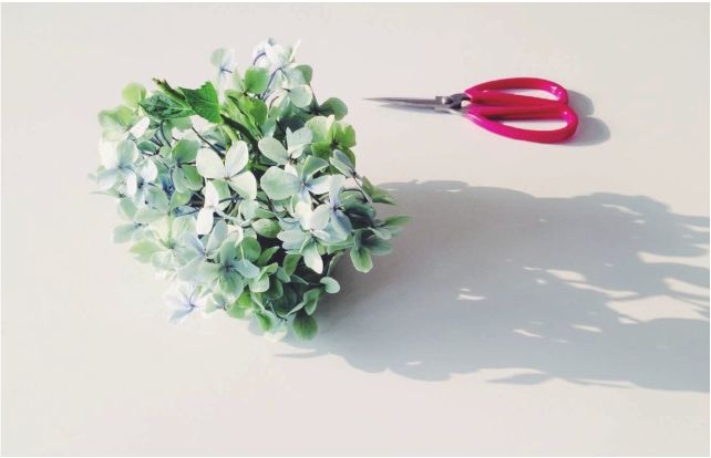 步骤一 将绣球花的其中一枝剪下来,放在盛满水的水盘或者宽口浅花器里面。用剪刀修剪一下这一枝的外形,让它看起来像一个半圆形,并确保花枝根部泡在水里。