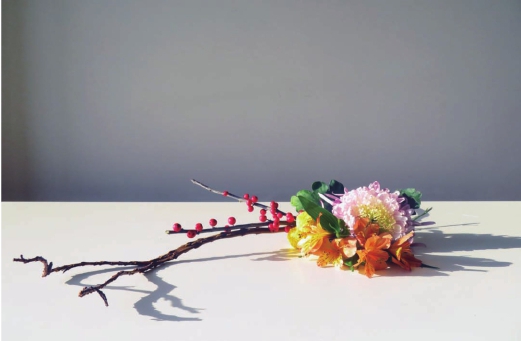 步骤七 从左至右,在最左侧的菊花到最右侧的石化柳的上部空间里,投入几枝冬青果,注意最高的冬青果的高度不超过石化柳,但最低的冬青果,也要略高于菊花的最高点,从左至右,冬青果的高低层次要有富于变化,有节奏感,不要呈现出阶梯状的走势。