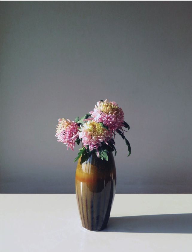 步骤四 在三朵菊花的斜后方插上一枝花头较小的菊花,高度与第二枝菊花相当。