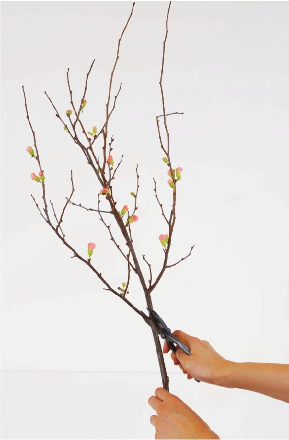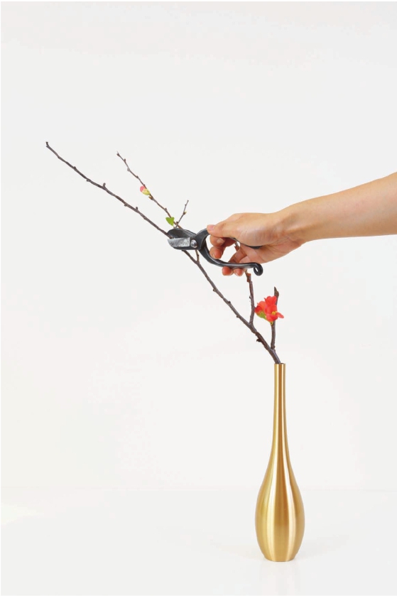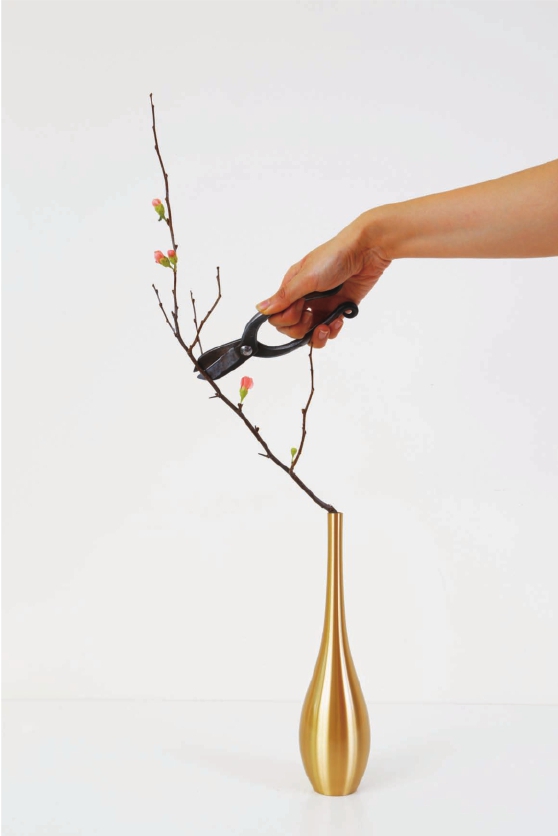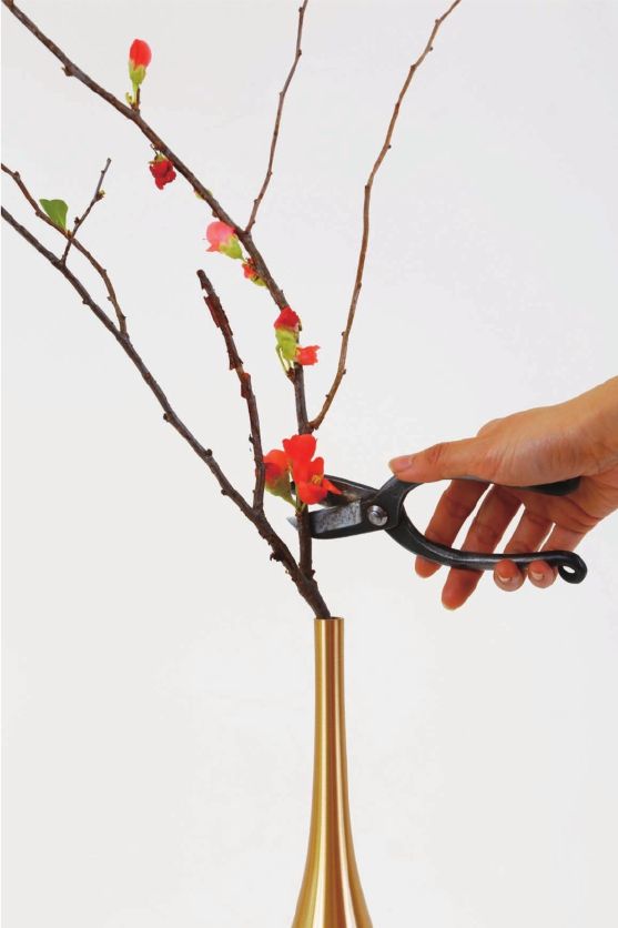 步骤二 将侧枝伸出来的这个转折口,放在花器口处,剪去这枝较高的枝条,因为这个胆瓶的整体高度并不是很高,而枝条过高会显得作品重心不稳。