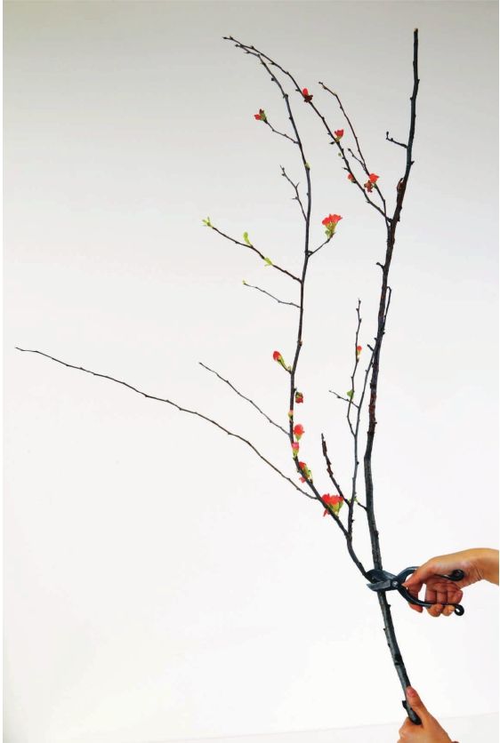 选出两枝木瓜海棠,一大一小,一疏一密,那么如何在这两枝木瓜海棠中择取一枝条用于插置这只小巧的胆瓶中呢?