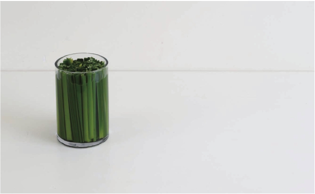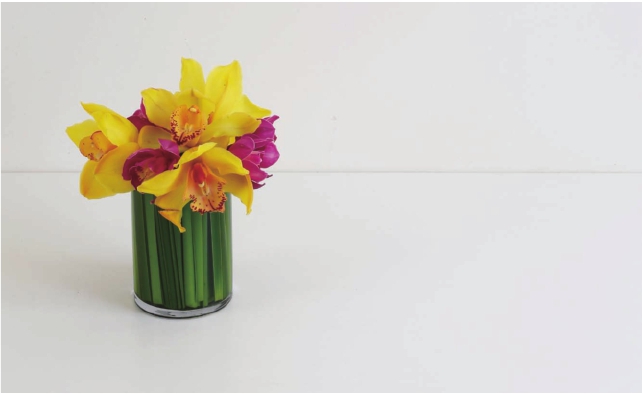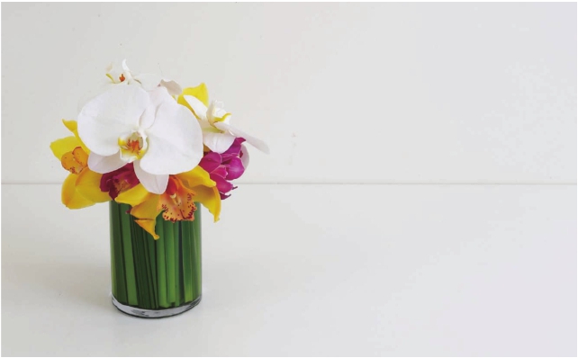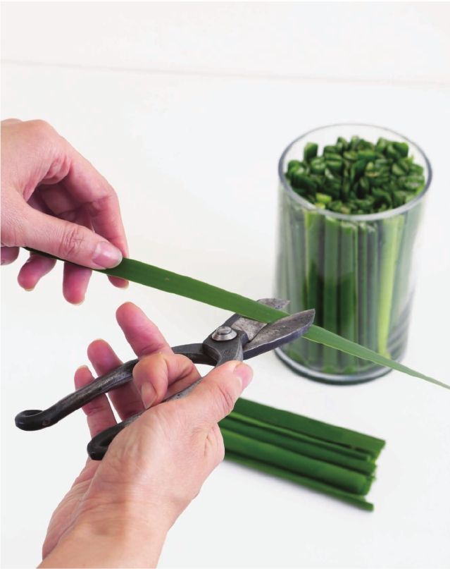 将蒲棒叶剪成略低于花器1厘米左右的长度,一条条地紧密排列塞进玻璃花器中。蒲棒叶是多年生水生或沼泽生植物,叶茎细长粗壮直立坚挺,是花艺中极好的固定植物。这一节中将它运用到花道的插置中,插置一款自由的小桌花。
