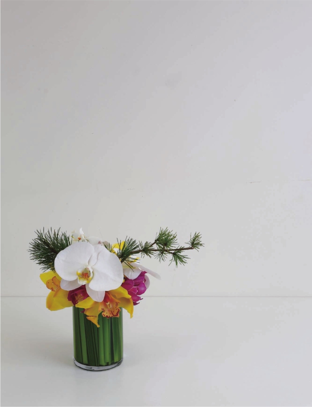 此节中选用的花材均是这个时节里常见的温室植物,易于购买到,北方的朋友在花市回家的途中应注意,不要让它们长时间暴露在寒冷的空中受冻。新春逛花市时为自己准备好花材,在家里亲自插置一个祥瑞的作品喜迎亲朋好友的到来吧。